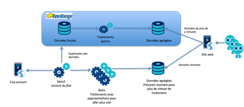 L'idée de l'architecture Lambda dans ce cas est d'utiliser Storm pour calculer au fil de l'eau une approximation des agrégats sur l'intervalle de temps nécessaire à Hadoop pour calculer les agrégats précis et pérennes.