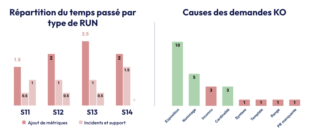 Graphiques montrant la répartition du temps passé par type de ticket de RUN (Ajout de métriques, Incidents, et RUN), et les causes des demande KO (Exposition, Nommage, Inconnu, Cardinalité, Syntaxe, Template, Range, PR manquante)