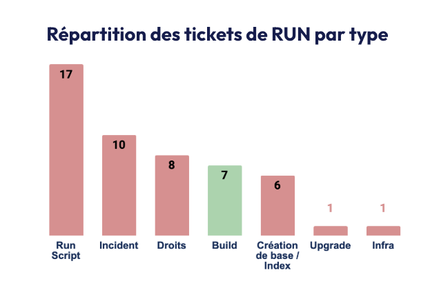 Graphique montrant la répartition des tickets de RUn par type. On y voit 17 tickets de run scriupt, 10 d'incident, 8 de droits, 7 de build, 6 de création de base et d'index, 1 d'upgrade et 1 d'infra.
