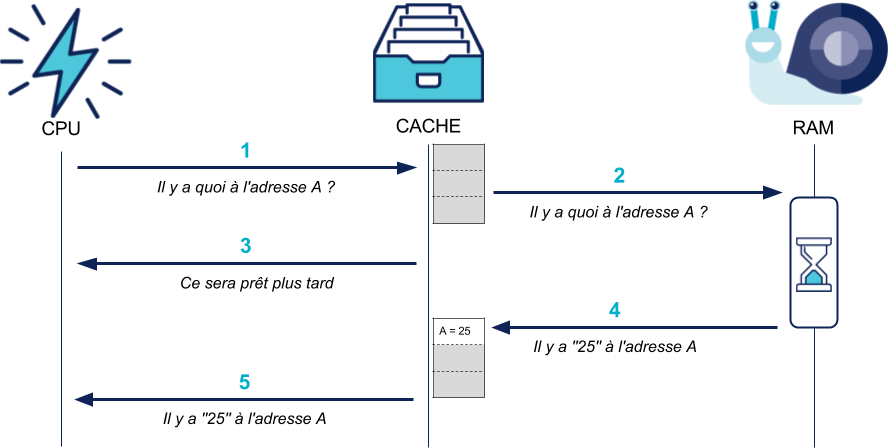 Le cache stocke la valeur récupérée et est capable de la renvoyer plus rapidement au CPU (jusqu'à 200 fois plus rapidement que la RAM) s'il la demande à nouveau :