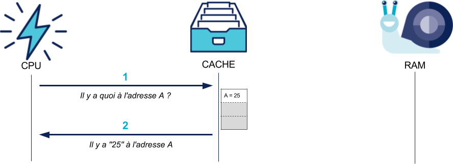 Le cache stocke la valeur récupérée et est capable de la renvoyer plus rapidement au CPU (jusqu'à 200 fois plus rapidement que la RAM) s'il la demande à nouveau :