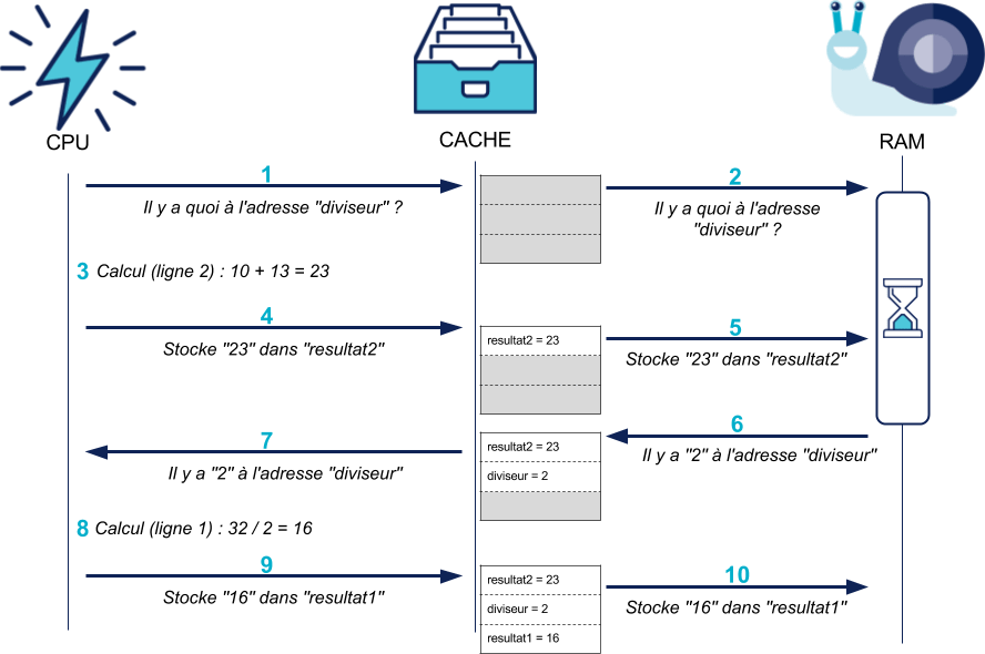 En pratique, quand le CPU a besoin d'une valeur en mémoire, il la demande au cache, qui la demande à la RAM.