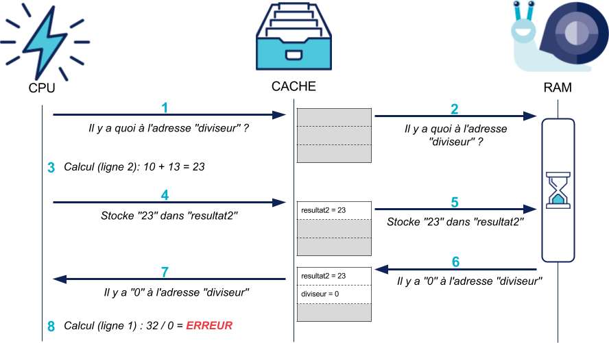 8 si vitesse(memoire_accessible_1) est rapide 9 ** afficher("le secret vaut 1")** 10 si vitesse(memoire_accessible_0) est rapide 11 ** afficher("le secret vaut 0")** 12 sinon 13 afficher("l'attaque a échoué")^<a id="ref2" href="#note2">2</a>^