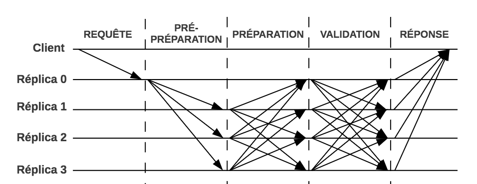 Un client soumet une requête au réplica principal, les autres répliques vont ensuite procéder aux trois phases pour se mettre d’accord sur la validation de cette requête.