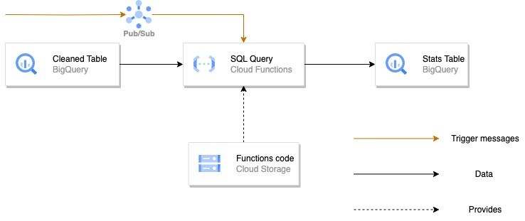 La Cloud Function “SQL Query” contient un code Python qui effectue une requête SQL sur la table “Cleaned table” afin de réaliser une analyse (dans notre cas une moyenne sur une colonne). Le résultat de cette requête est écrit dans une nouvelle table BigQuery appelée “Stats table”. L’utilité de cette table est de voir l’évolution de l’analyse, puisque le contenu qui est analysé change à chaque fois que de nouveaux fichiers sont ajoutés à la table.