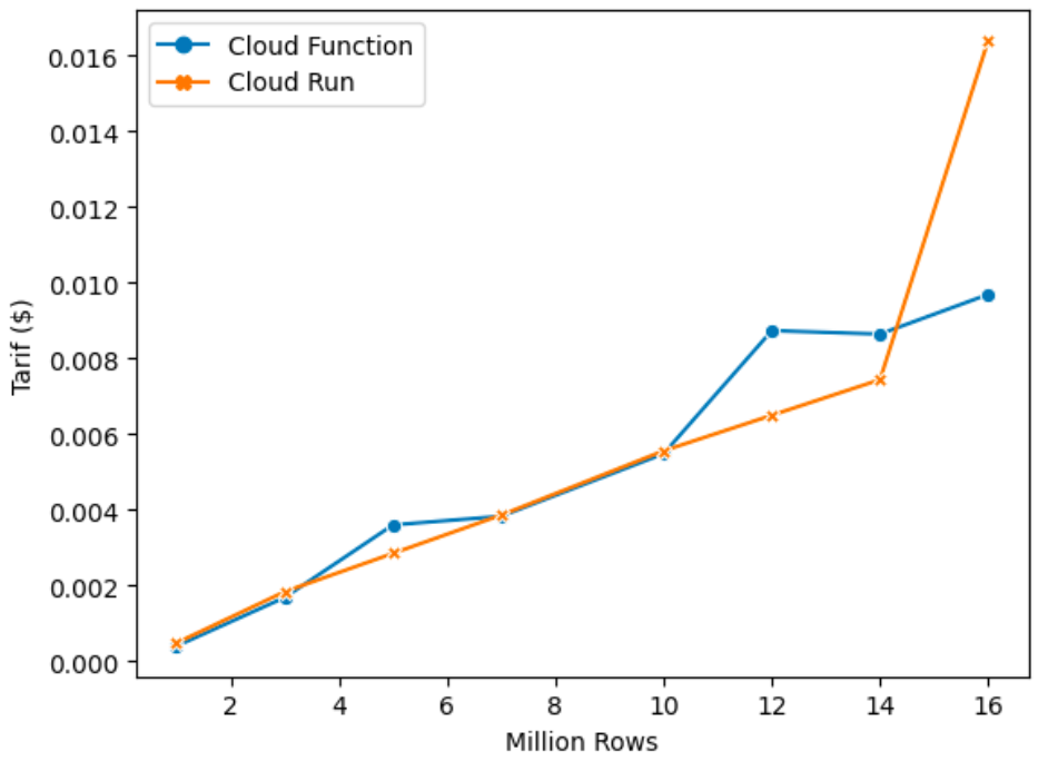 La seconde remarque qu’on peut faire est la meilleure performance des Cloud Functions sur les fichiers de petites tailles, la performance égale entre les deux services pour les fichiers de tailles moyennes et passer un certain seuil (ici à 10 millions de lignes), la meilleure performance de Cloud Run. Ces résultats confirment ce que nos recherches théoriques avaient donné.