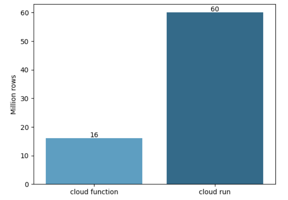 On observe que pour Cloud Function nous avons pu traiter au maximum un fichier de 16 millions de lignes tandis que ce nombre s’élevait à 60 millions de lignes concernant Cloud Run, ce qui représente une multiplication par 3,75 des capacités, en termes de mémoire, entre les deux services.