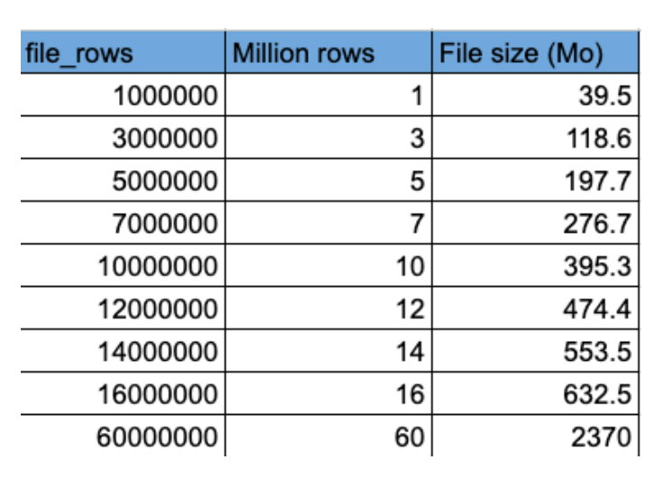 Voici le tableau qui pour chaque taille de fichier (en million de lignes) utilisé dans cette étude, indique la quantité de mémoire que ce fichier occupe :