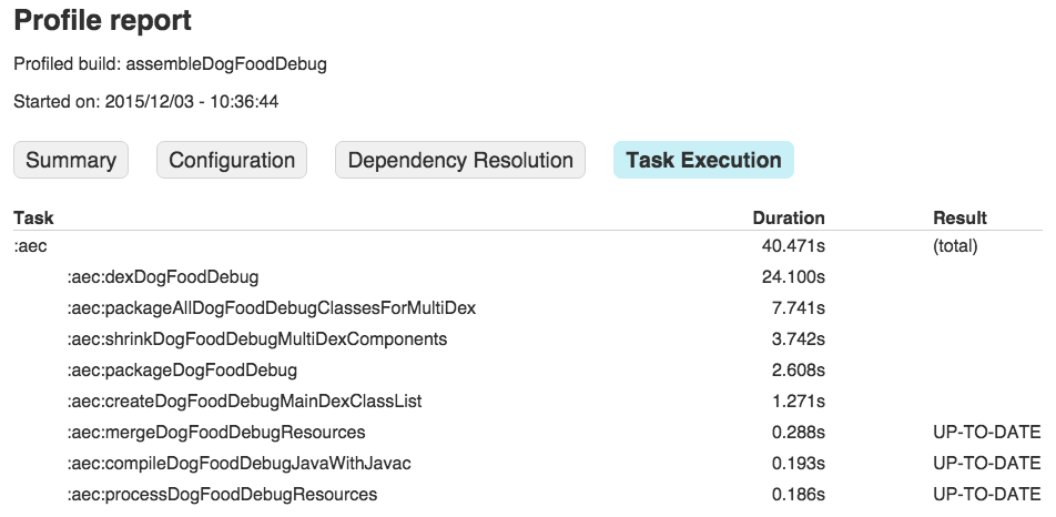 build.gradle. In that case, the duration will only depend on how many libraries you have to pull and how fast your Internet connection is. - Task execution This is usually the longest step, which is subdivided in all the different tasks necessary to achieve the main task you want. It includes generally a compiling task, a dexing task and a lot more depending on the task you run and the context. We can notice that some subtasks are way lengthier than others: in the screenshot above the subtasks related to multidexing take a large amount of time.