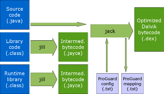 The new Jack compiler is able to perform the compilation directly from .class files to .dex. Jill is a tool that converts existing .jar files (generated thanks to the regular tool chain) to files directly usable by the Jack compiler. The following diagram summarizes the inputs and outputs of this new build system.