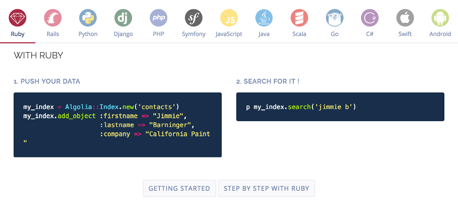 C’est le cas d’Algolia, un moteur de recherche en SaaS, qui propose dès sa page d’accueil un SDK dans 14 langages / frameworks différents. Si nous allons dans la doc, il en existe au total 21, plus 6 plugins CMS.