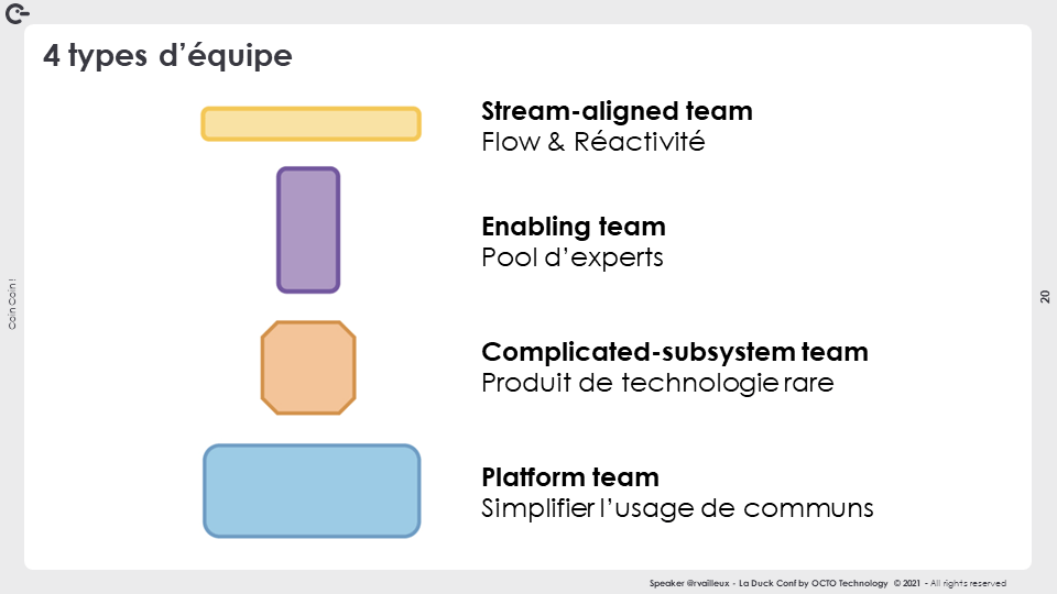 - Stream-aligned team : flow et réactivité, dédié à l’atteinte des objectifs de l’entreprise.