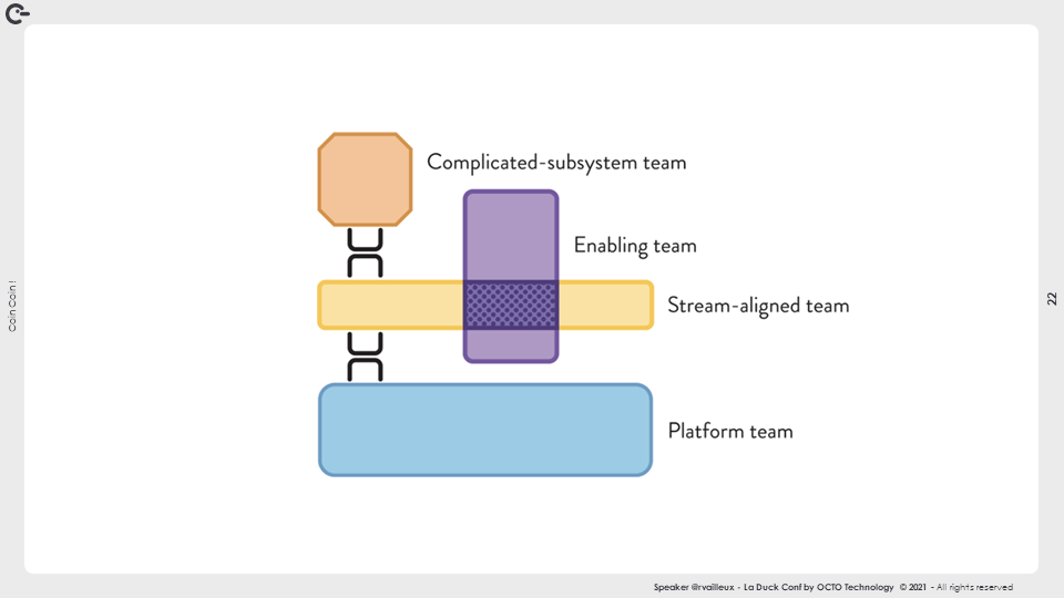 - Complicated-subsystem team : regrouper des compétences de pointe pour abstraire de la complexité essentielle dans un produit mis à disposition du reste de l’organisation.