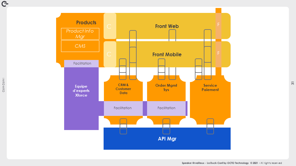 | Supporter les chantiers de transformation : “L’omnicanal passe par la mise à disposition des informations CRM et des services OMS pour l’ensemble des canaux.” | Complicated Subsystem t**eam “**CRM” et “OMS” | X as a service avec “Products” |