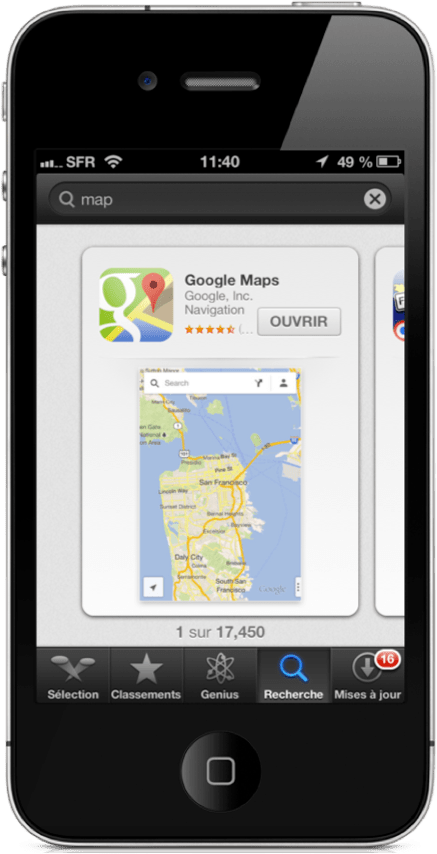 Depuis iOS 6, l'affichage des résultats de recherche a changé sur l'App Store. L'utilisateur ne voit qu'une application à la fois et le premier screenshot est affiché en aperçu. Le choix de cette première image devient alors stratégique ! Un mauvais visuel pouvant faire chuter le taux d'ouverture de la fiche et donc du téléchargement !