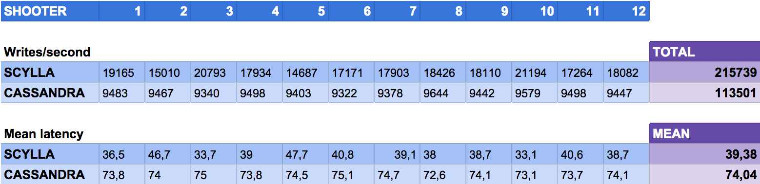 The ScyllaDB cassandra-stress tool is used to benchmark the clusters. We got the following results, more detailed in the table below: