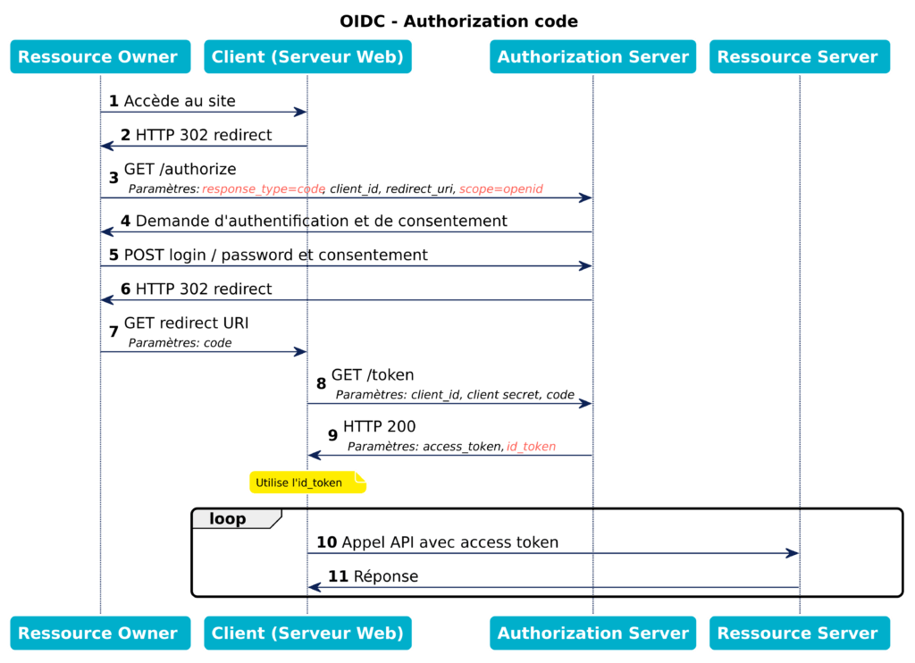 Le flow OAuth2 Authorization Code décrit plus haut s’applique, avec quelques spécificités. Vous devez d’abord rediriger le navigateur web (ou l’appareil mobile) vers l’URL d’autorisation, avec le paramètre scope pré-rempli, et ce scope doit contenir “openid”. D’autre part vous devez remplir le paramètre “response_type” avec la valeur “code”.