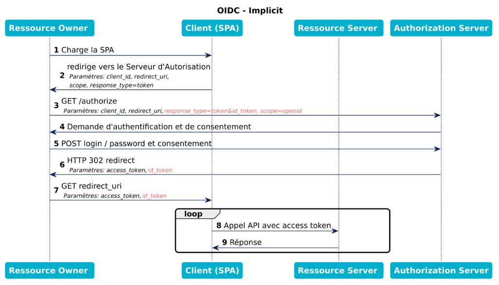 Voici un diagramme de séquence de ce scénario (en rouge, les différences par rapport au flow Implicit d’OAuth2).