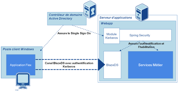 Le diagramme suivant résumé les interactions entre les différents modules applicatifs qui permettent à l’extension Kerberos de Spring Security pour protéger le canal BlazeDS en SSO.