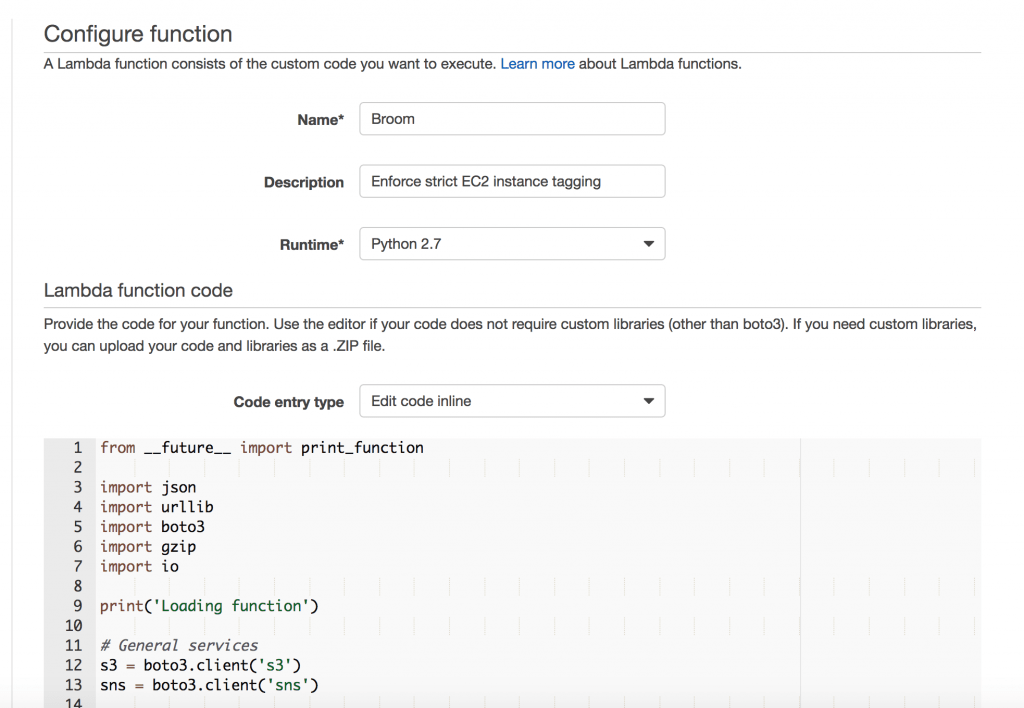 Finally, let’s create the actual Lambda function. You can create a package for your function and then upload it directly to AWS using the CLI. This is useful when you are using dependencies that are not standard and that are not already present in the AWS Lambda environment. This is not the case with the Broom function, so you can just use the AWS console to create it. I used Python and boto3 for Broom. You can see the source code here.