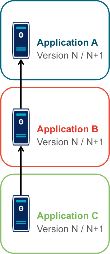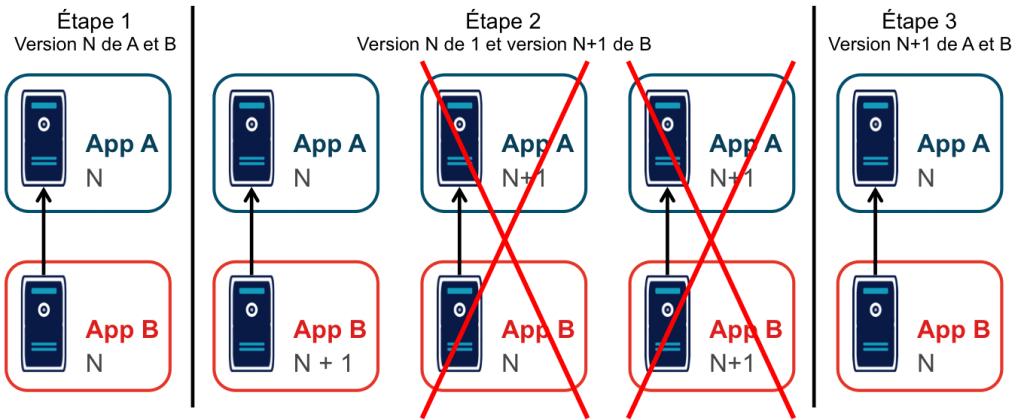 Chaque application choisit sur quelle version de service se brancher, ce qui supprime le problème de dépendance. Par exemple, la version N+1 de l’application B peut choisir d’utiliser la version N ou la version N+1 de A.
