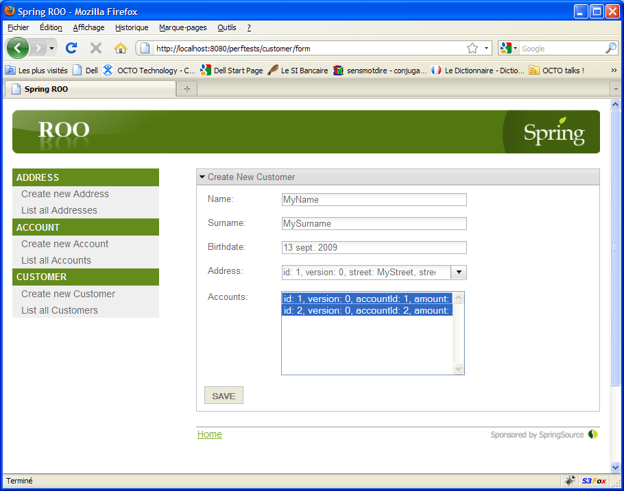 Roo est un outil visant à améliorer la productivité d'un développement Java basé sur Spring. Cet outil est basé sur un générateur de code aller-retour (round-trip code generator). Concrètement il se présente comme une ligne de commande qui avec des instructions de haut niveau comme new persistent class jpa -name ~.domain.Employee génère des blocs de code implémentant la fonctionnalité, par exemple la persistance. Il est ainsi capable de générer en moins de 20 instructions, comme dans l'exemple ci-dessous, une petite application fonctionnelle qui peut être lancée avec mvn tomcat:run. create project -topLevelPackage com.octo.mbo.roo.perftests install jpa -provider HIBERNATE -database HYPERSONIC_IN_MEMORY new persistent class jpa -name ~.domain.Address add field string street -notNull add field number streetNumber -type java.lang.Integer add field number zipCode -type java.lang.Integer add field string city add field string country new persistent class jpa -name ~.domain.Account add field number accountId -type java.lang.Integer add field number amount -type java.math.BigDecimal new persistent class jpa -name ~.domain.Customer add field string name -notNull add field string surname -notNull add field date jpa birthdate -type java.util.Date add field reference jpa -class ~.domain.Customer -fieldName address -type ~.domain.Address -notNull add field set jpa -class ~.domain.Customer -fieldName accounts -element ~.domain.Account -mappedBy accountId -notNull false new controller automatic -name ~.web.AddressController -formBackingObject ~.domain.Address new controller automatic -name ~.web.AccountController -formBackingObject ~.domain.Account new controller automatic -name ~.web.CustomerController -formBackingObject ~.domain.Customer La complétion implémentée sur la ligne de commande accentue encore la rapidité de prise en main. De cette façon, Roo cherche à adresser la lourdeur qui peut ressentie pour adresser un besoin simple en Java. En effet, pour afficher un simple écran CRUD il faut écrire traditionnellement une quantité de code assez importante avec peu de valeur différenciante d'un projet à l'autre. Roo propose de limiter cette lourdeur en générant le code correspondant. Pour l'instant Roo en est au stade de la RC1 et les remarques de cet article s'appliqueront à cette version.