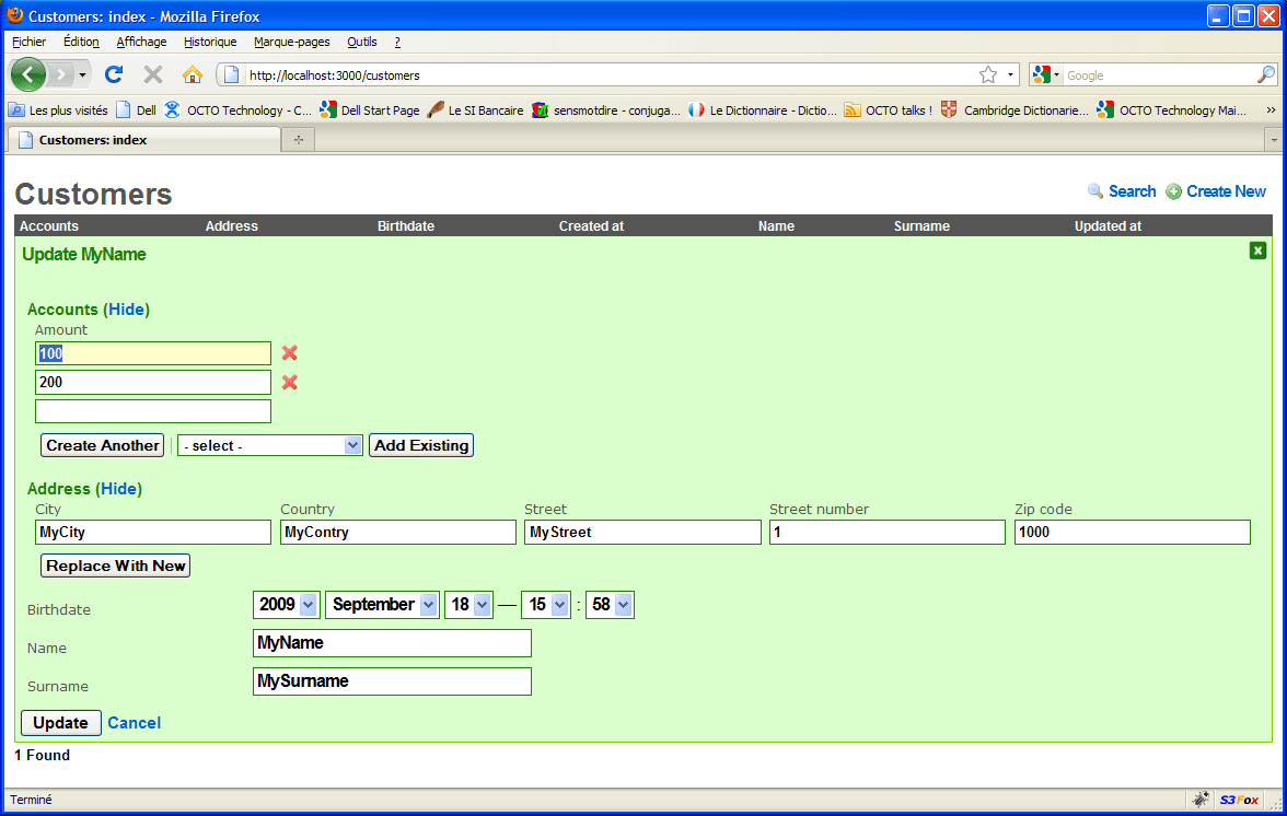 Grails et Roo ont des fonctionnalités de génération native très comparables. Sur l'exemple d'une classe Customer possédant une relation 1-1 avec une classe Address et une relation 1-n avec une classe Account, ils génèrent tous les deux des écrans qui prennent en compte les relations mais les présentes sous un angle technique (identifiant, ou représentation toString()). Rails quand à lui propose une génération très simple qui ignore les relations, mais un plugin active scaffold réalise la fonctionnalité de génération d'écrans de la façon la plus complète des trois. Comme le montre les copies d'écrans cependant, l'interface issue d'une génération ne pourra être livrée en l'état, et comparer ces outils sur la seule génération d'écran a finalement assez peu d'intérêt.
