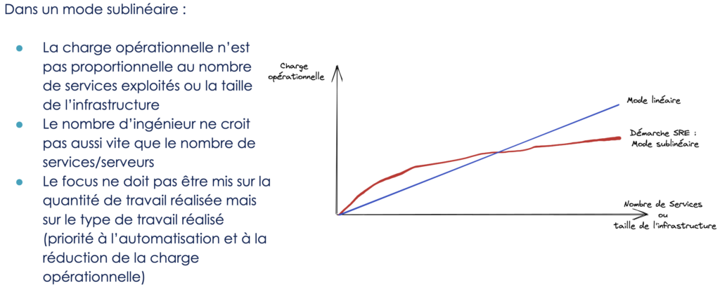 Sans automatisation, la charge opérationnelle et manuelle est directement proportionnelle à une combinaison du nombre de serveurs, du nombre de service, de la taille de l'infrastructure ou du nombre de clients. L'automatisation est le meilleur moyen de minimiser le ratio “travail / trafic” et de découpler la charge opérationnelle de la taille de l'infrastructure ou de la quantité de trafic : ce que l'on cherche à avoir, c’est la même charge de travail qu'on ait 10, 50 ou 200 serveurs.