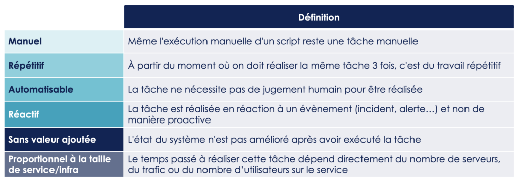 Un effort intentionnel doit être mis pour minimiser cette charge opérationnelle, et le meilleur moyen de limiter ce “toil”, c’est l’automatisation.