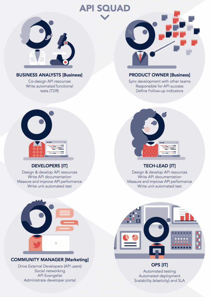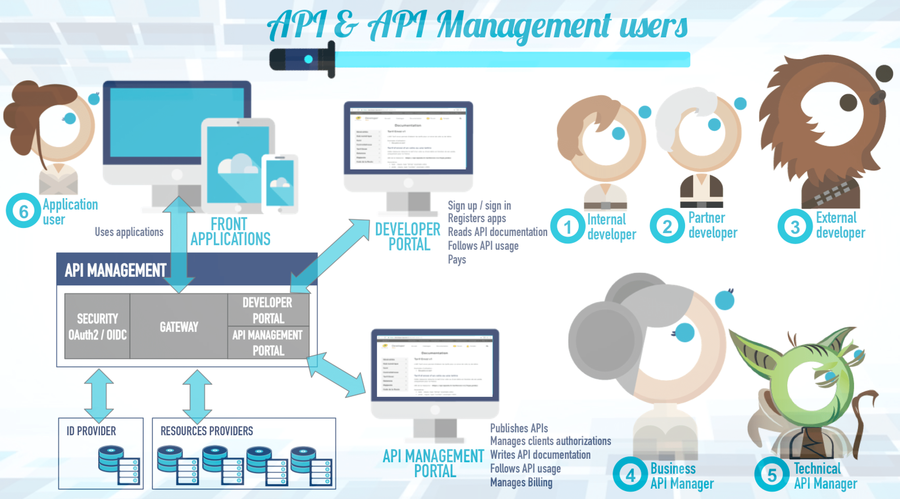 Le schéma suivant illustre les utilisateurs et les rôles autour de l'API et de son management :