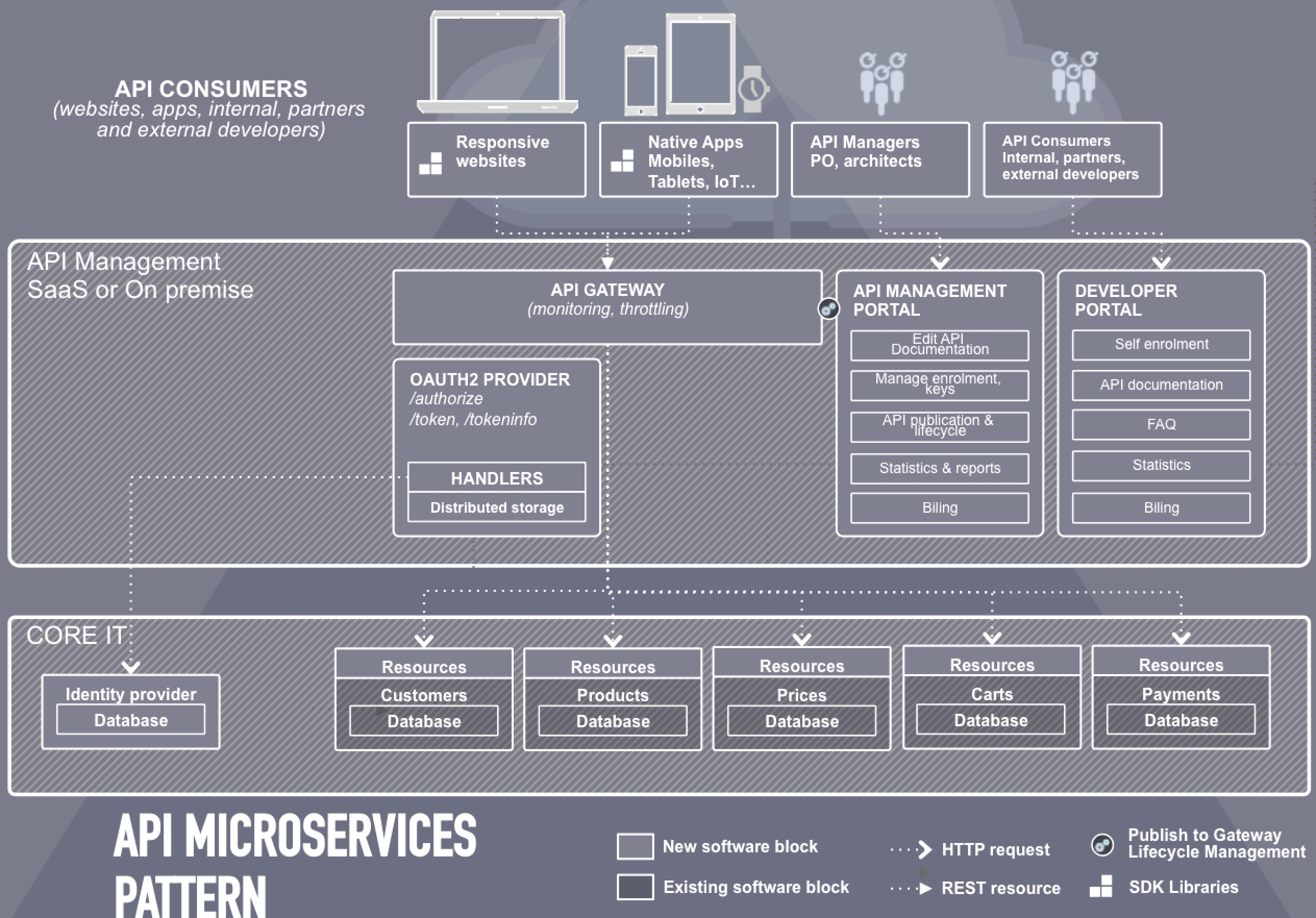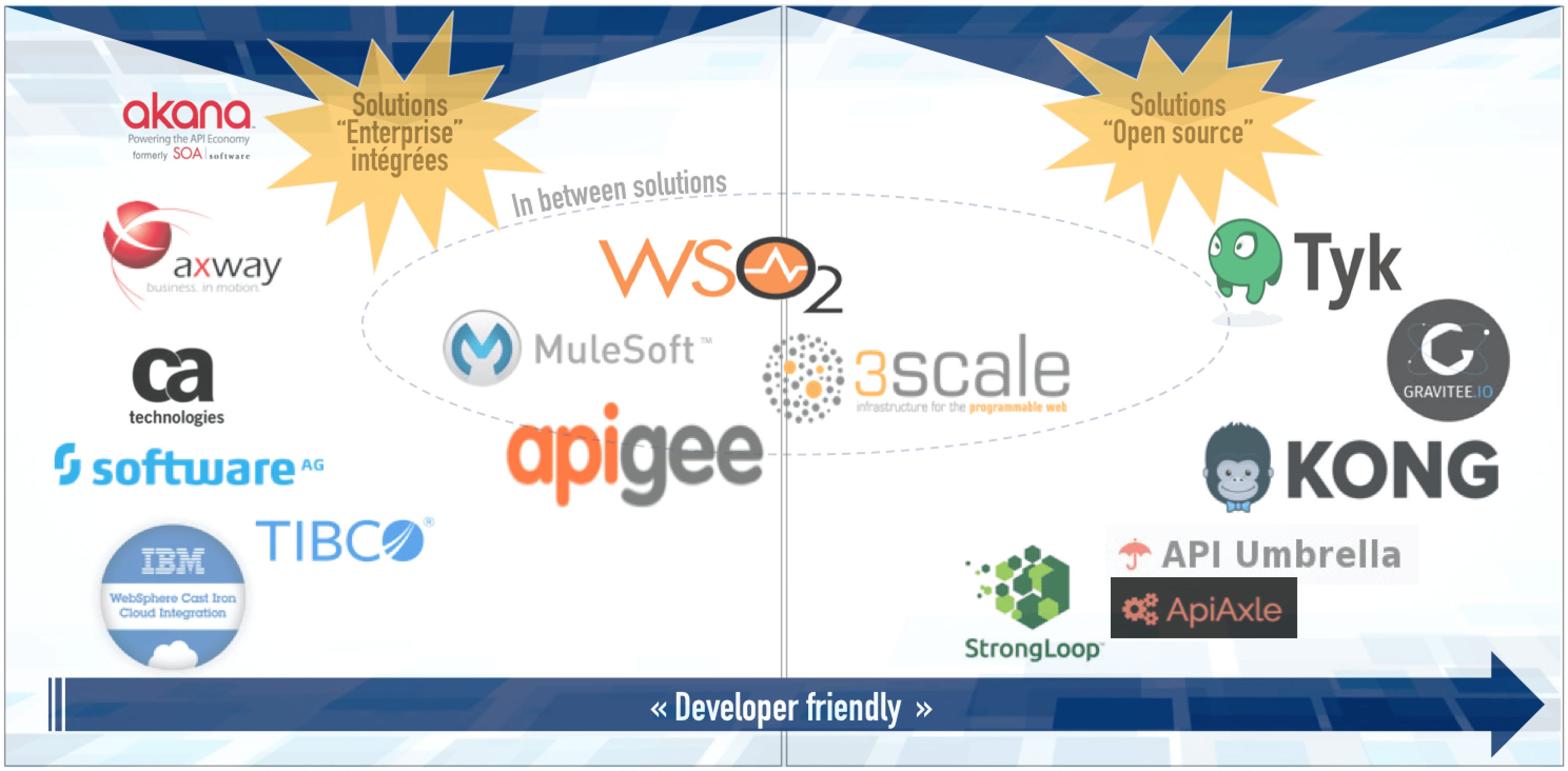 Pour aider à l’industrialisation de la consommation des ressources de l’entreprise et accélérer la mise en oeuvre d’API, de nouvelles solutions ont émergé à foison : les solutions d’API Management. Ce marché en plein essor et encore en voie de consolidation, vient récemment de voir apparaître des acteurs comme RedHat, Google, etc.