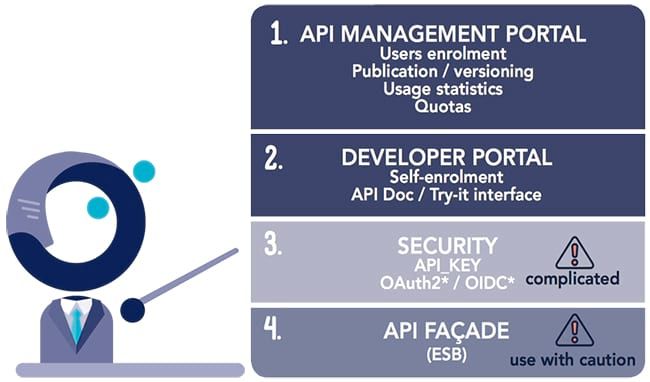 En effet, la mise en oeuvre d’une API draine des problématiques complexes qui portent sur trois niveaux :