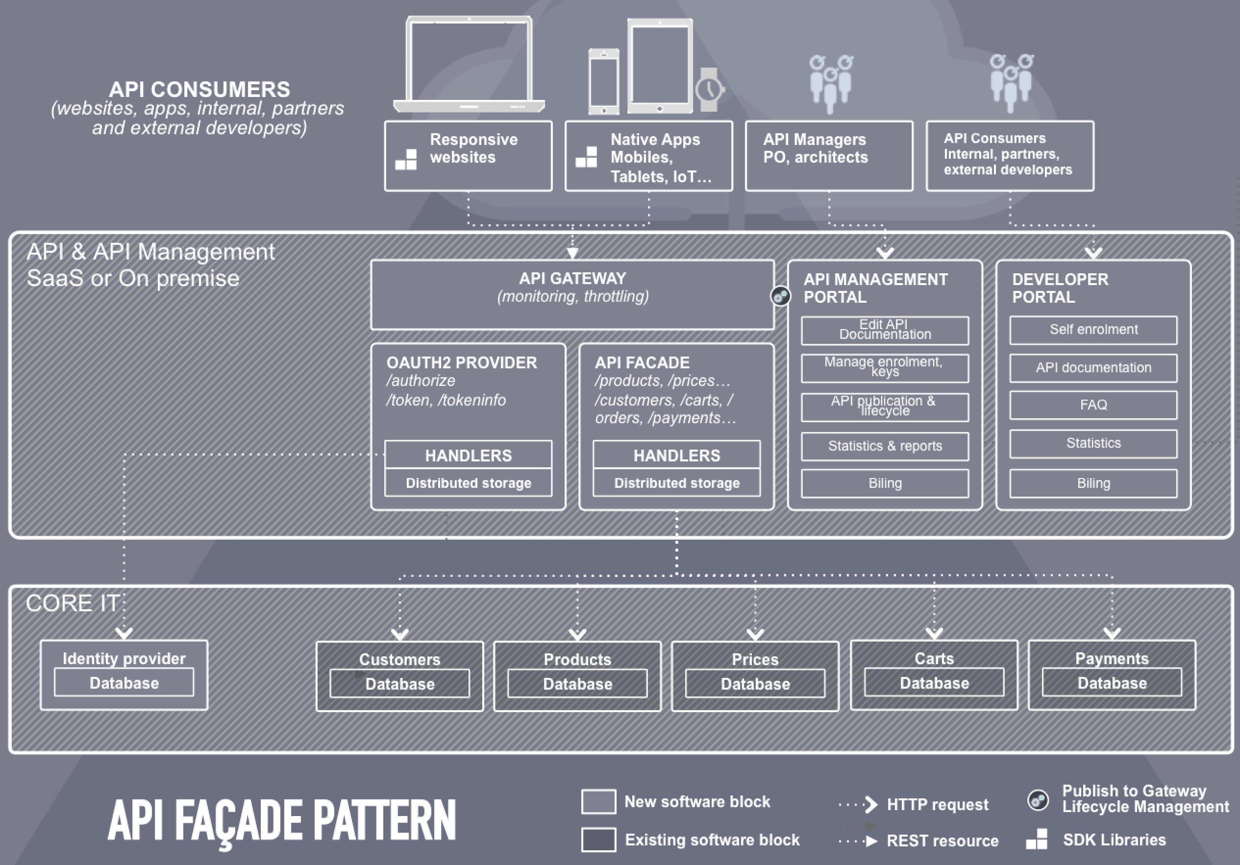 Notre conviction est qu’il est souvent préférable de développer l’API en spécifique (qu’il s'agisse d’une Façade non) . L’API qui devient le point d’accès unique au SI, est un composant stratégique différenciant. Le portail développeur, le portail d’API Management et la sécurité sont moins différenciants et peuvent être pris en charge par des solutions sur étagère.
