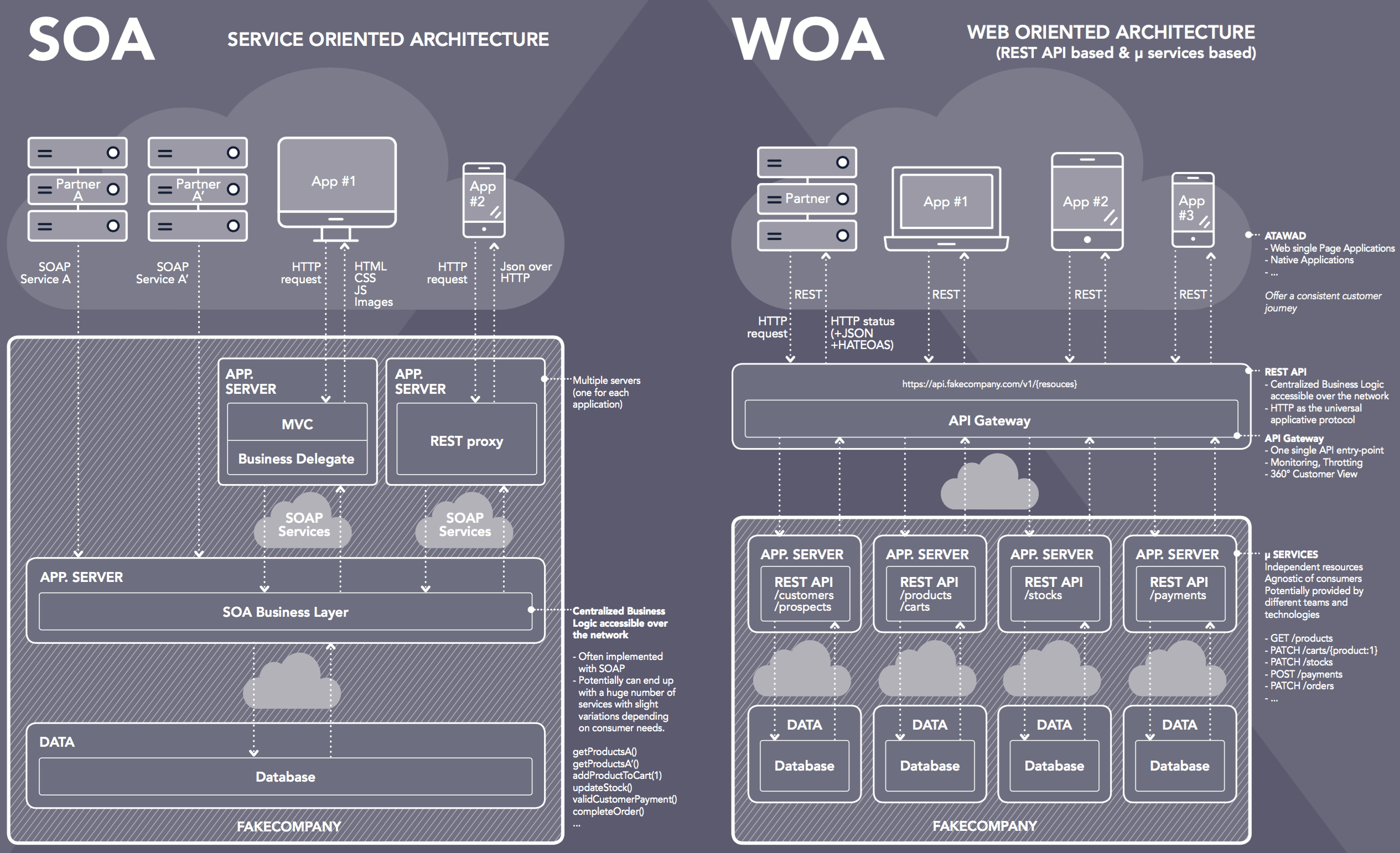 WOA : Dans cet article, nous utilisons cet acronyme pour : WOA = SOA + WWW + REST + Microservices. Voir aussi la définition section WOA dans la définition SOA Wikipedia. Voir la définition Gartner.