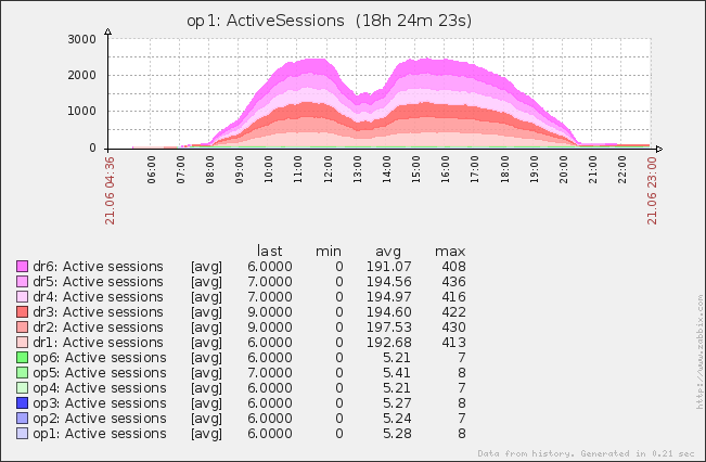 S’il est utile de consulter ces informations à la demande lorsqu’un problème survient, il est préférable d’essayer de les anticiper et ainsi passer d’un réactif à un mode proactif. Au même titre que l’on supervise les équipements réseaux et les serveurs, il est intéressant de suivre dans le temps le comportement de l’application et de détecter des situations anormales. Pour ca, les outils du monde de l’infrastructure peuvent répondre à notre besoin très simplement : Zabbix, Cacti sont deux outis OpenSource parmi d'autres qui permettent d’historiser les indicateurs souhaités dans la durée et ensuite de les présenter sous forme de graphique. Voici 2 exemples, fait avec Zabbix. Dans le premier, on suit le nombre de sessions actives sur la production. La production comporte 6 serveurs, chaque serveur à sa couleur. On voit très bien le creux à midi pendant la pause déjeuner.