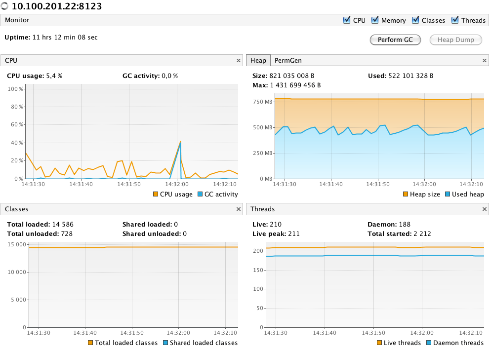 En standard, la JVM fournit nombre d’informations sur son activité. Dans l’exemple ci-dessous, VisualVM utilise JMX pour