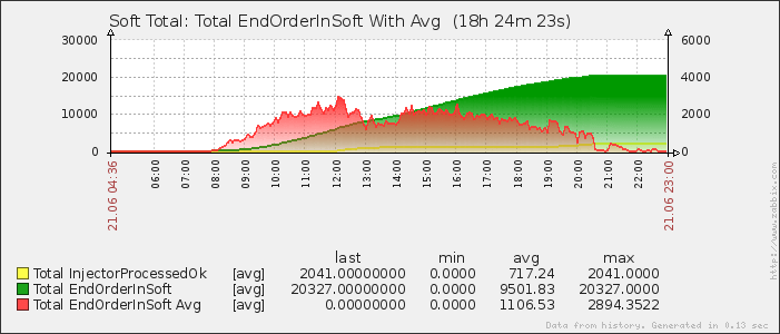 Dans le deuxième exemple, on suit le nombre de commandes prises dans la journée. C’est aussi une information consolidée depuis tous les serveurs (courbe verte). On trace aussi la dérivée, afin de pouvoir suivre le nombre de commandes prises par heure (courbe rouge). On retrouve le creux de midi.