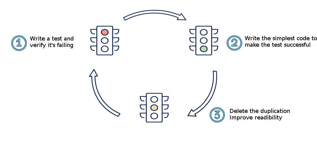 As a reminder, TDD consists in: begin by creating a test; verifying it’s failing; writing the code necessary to make the test succeed; relaunching the test and verifying it’s succeeding as well as the previous tests and finally refactoring the code before starting a new cycle.