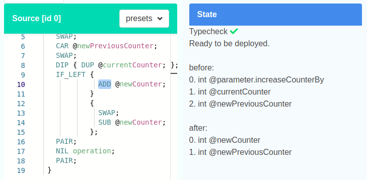 As you can see, in the “code” section, it is not possible to define different functions like in Solidity but you you can define what is called an entrypoint with annotations (%increaseCounterBy et %decreaseCounterBy) in the above example. And then in the code, with the IF_LEFT Michelson instruction, we can do the implementation of each entrypoint/function.