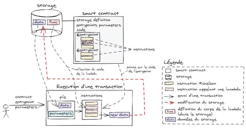 L’idée est de déporter une partie du code du “smart contract” dans une fonction dite “lambda” dont le corps de la fonction est défini dans le storage. Le corps de la fonction lambda peut être modifié par l’invocation d’un entrypoint du “smart contract”. Le schéma ci-dessous illustre l'exécution d’une transaction qui utilise une lambda.