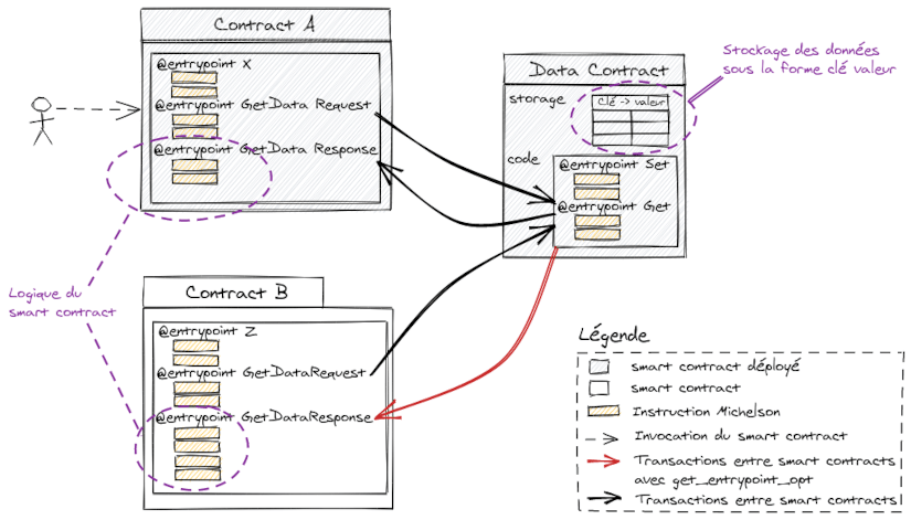 Ce schéma illustre la situation décrite précédemment (liée aux entrypoints du contrat). Les lignes en rouge doivent utiliser “get_entrypoint_opt” , celles en noires peuvent utiliser “get_contract_opt” car la totalité de l’interface du contrat est connue.