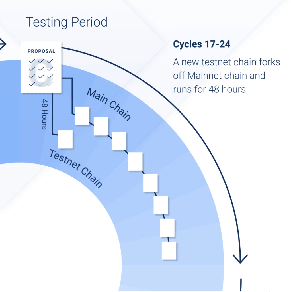 Nous pouvons nous demander pourquoi cette phase ne dure seulement 48 heures alors que la période dure 22 jours. Le but de ce fork est simplement de vérifier que la migration de l’ancien protocole vers le nouveau fonctionne correctement. Dans le cas de cette proposal, il serait très facile de tester si la feature fonctionne en faisant une transaction dans le cas où l’utilisateur a moins de 10 tezzies ou plus de 10 tezzies mais en général les features sont plus complexes. Il serait donc idéal de prolonger la durée de vie de cette chaîne de test pour tester plus en profondeur et être sûr de la robustesse de ce nouveau protocole.