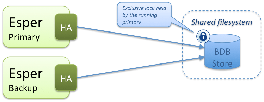 You will notice that this is all about recovery, i.e. being able to catch up after a crash with losing as little data as possible. What about clustering and load balancing? The engine and the APIs give very little support for these needs. The only provision is for switching between a primary and a backup EsperHA engines, in a shared-data situation where the store is a BerkeleyDB database: