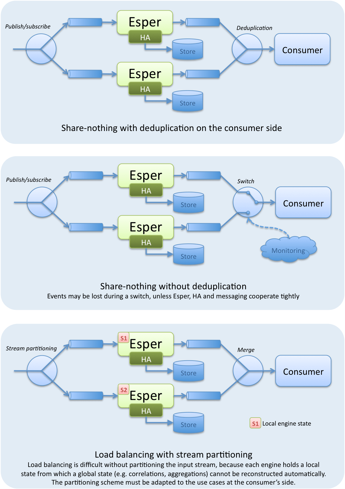 All other situations (load balancing, share-nothing, global persistence across CEP engines and messaging system) must be handled outside of the engine with message routing patterns, possibly with the help of the monitoring facilities offered by EsperEE: