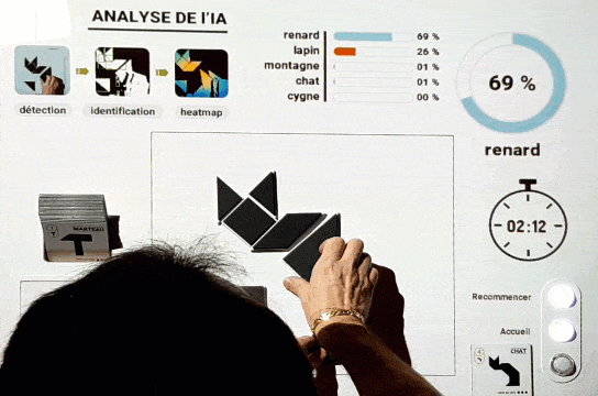 ![]() | « Permettre à des visiteurs de jouer au puzzle Tangram et de voir en temps réel l'évolution de la compréhension de l'IA en fonction du positionnement des pièces. » |