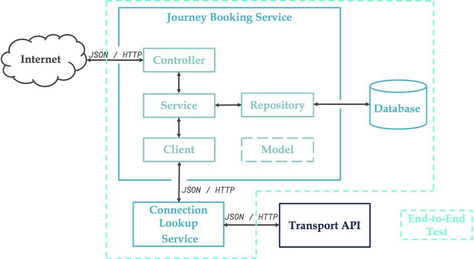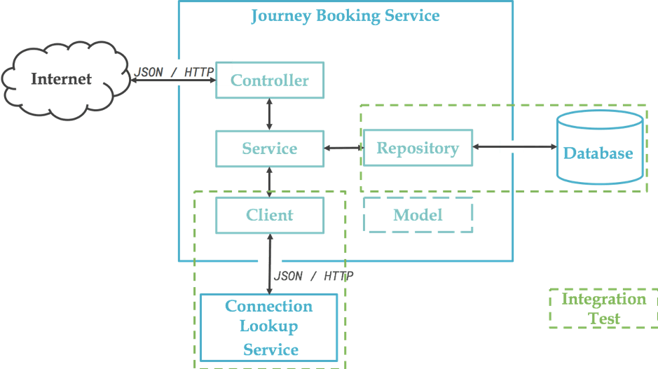 Despite the tests we’ve put in place, there are still scenarios that can slip through the cracks. Indeed, so far we have isolated all our tests, but what will happen when we connect everything together? Are we sure that our journey-booking component correctly calls the connection-lookup? Is the database properly configured and accessible?