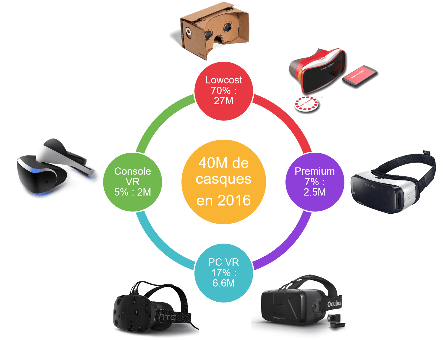 Les projections pour cette année prévoient une adoption du public pour des casques low cost, type Google Cardboard et ses déclinaisons en plastique. Les casques premium et les consoles de jeux ne représentant que 12% du marché, un marché de niche donc. Les entreprises de création de contenus peuvent être frileuses, elles ont investi sur le contenu 3D il y a quelques années, puis la 4K en 2015, maintenant le 6K-8K sans forcément trouver le marché adéquat car ces nouvelles technologies nécessitent un coût d’équipement pour la captation mais aussi pour la diffusion. Les clients ne sont pas encore tous équipés : les télévisions 4K sont disponibles partout mais il faut être relié à la fibre optique pour bénéficier pleinement de ces contenus. Ce frein pourrait bien ressurgir pour les événements "live" diffusés en VR comme les concerts ou le sport.