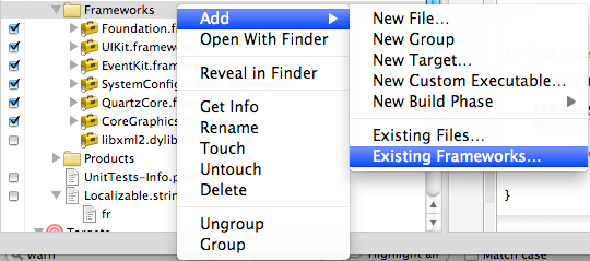 Le framework EventKit n'est pas ajouté par défaut dans votre projet sous XCode, il faut le faire manuellement. Pour cela, procéder comme habituellement via un click droit sur Frameworks :