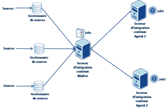 • Agent : Un serveur d’intégration continue secondaire ou esclave du principal. Il reçoit des ordres de build du serveur principal, et se synchronise avec ce dernier à la fin de l’exécution de ces ordres