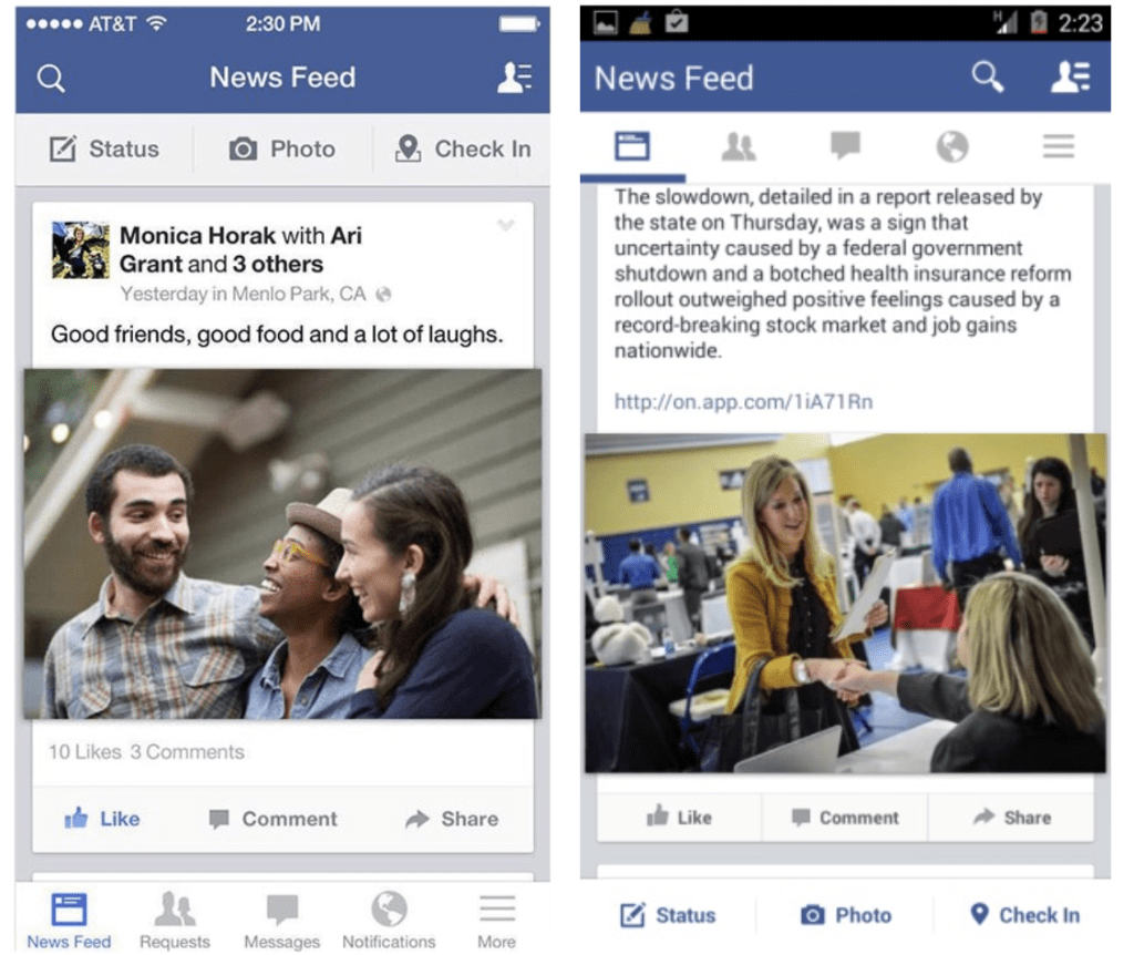 Le feed de news de l’app Facebook en 2013, à gauche sur iOS et à droite sur Android. Notez la différence de placement des onglets : en bas sur iOS et en haut sur Android.